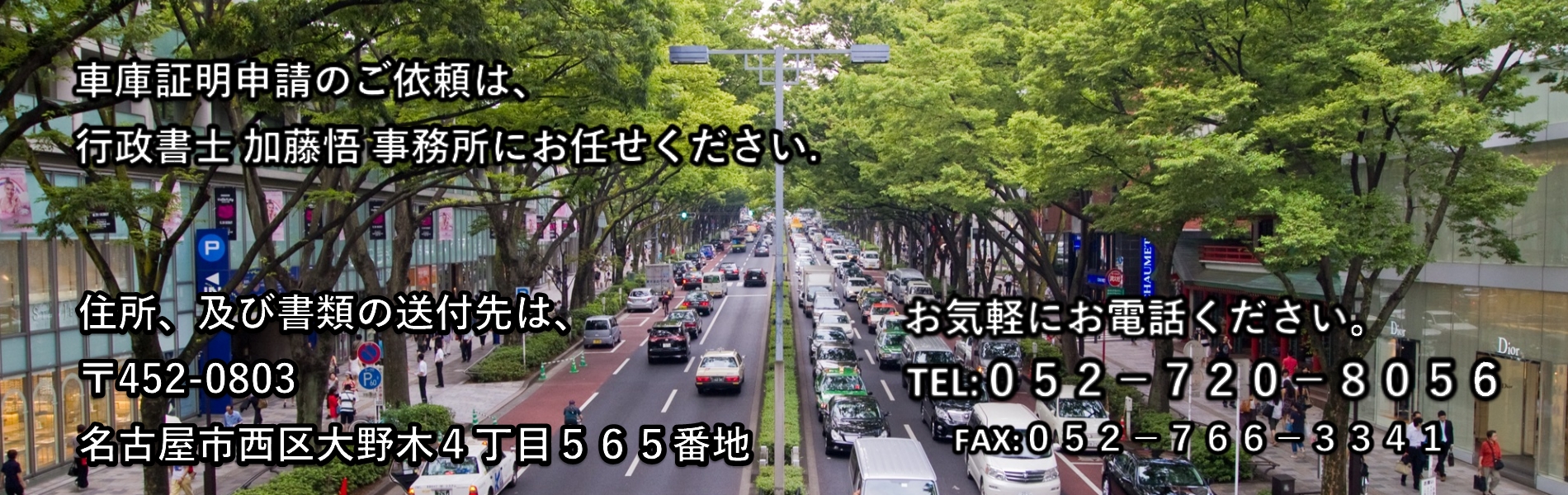 行政書士 加藤悟 事務所では、保管場所証明の申請(届出)を、事務所所在地である名古屋市西区を中心に、登録自動車、報酬額(税込)6,000円から、軽自動車、報酬額(税込)※5,500円からご依頼いただけます。